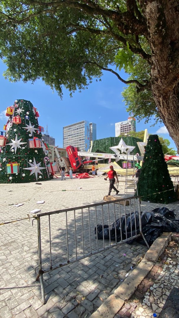 A Secretaria de Cultura e Economia Criativa do Amazonas informou que um acidente ocorreu na manhã deste domingo (23/11) durante a montagem da árvore de Natal no Largo de São Sebastião, no Centro de Manaus. O guindaste utilizado pela empresa responsável pela instalação da estrutura tombou enquanto erguia módulos metálicos para o enfeite natalino.