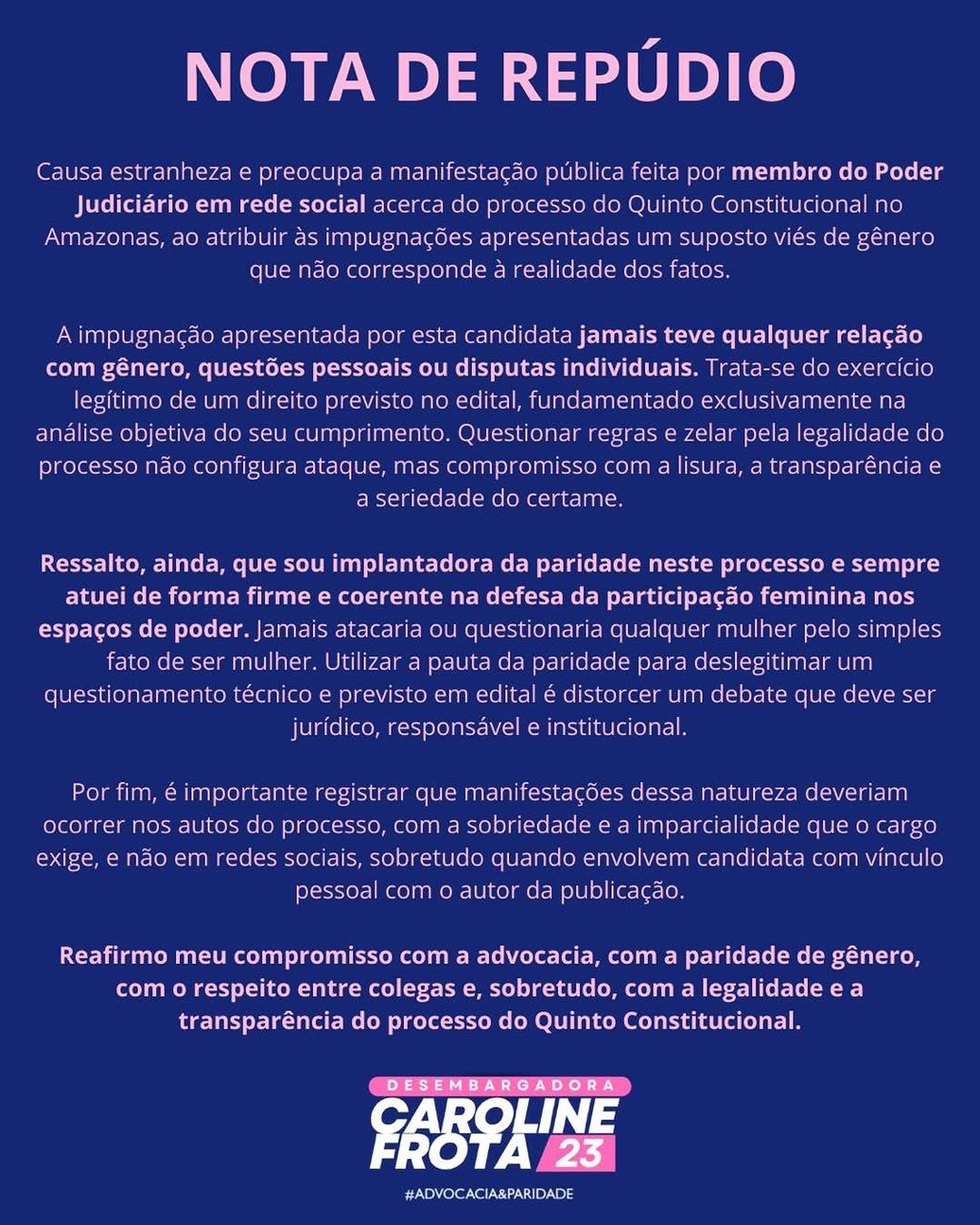 A advogada amazonense Caroline Frota, candidata à vaga do Quinto Constitucional destinada à advocacia no Tribunal de Justiça do Amazonas (TJAM), divulgou uma Nota de Repúdio após manifestação pública do desembargador Flávio Pascarelli em redes sociais sobre o processo de escolha do Quinto.