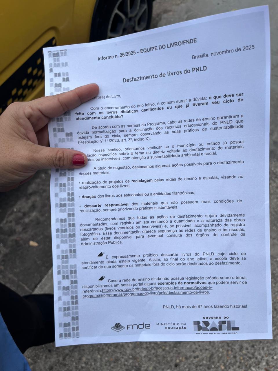Pais afirmam que faltaram livros para várias turmas em 2025. Se confirmado, o descarte de material novo pode configurar falha grave de gestão, desperdício de recursos públicos e descumprimento das normas do PNLD.