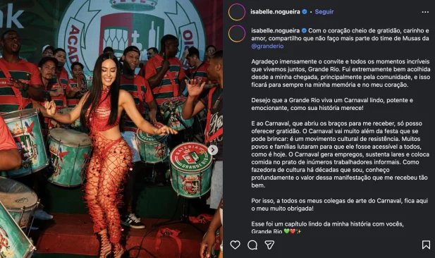 Conhecida nacionalmente após sua participação no Big Brother Brasil e também por sua trajetória como cunhã-poranga do Boi Garantido, Isabelle destacou que a decisão foi tomada de forma serena e que deixa a escola com sentimentos positivos. “Com o coração cheio de gratidão, carinho e amor, compartilho que não faço mais parte do time de musas da Grande Rio”, escreveu.