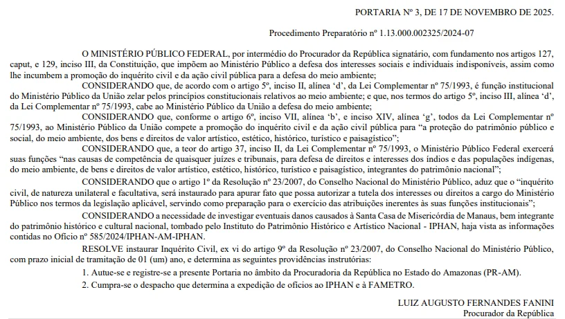 O Ministério Público Federal (MPF) abriu um inquérito civil para apurar possíveis danos à Santa Casa de Misericórdia de Manaus, um dos prédios históricos mais antigos e simbólicos da capital amazonense. A portaria, assinada pelo procurador da República Luiz Augusto Fernandes Fanini, foi publicada nesta quarta-feira (19) e determina prazo inicial de um ano para conclusão das apurações.