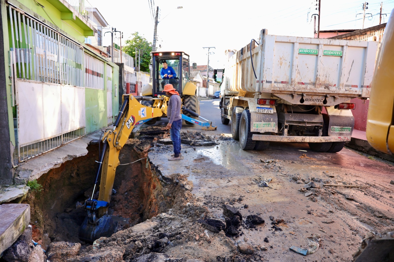 Após a formação da cratera de três metros de profundidade na rua Papiro, as equipes, com o apoio de uma escavadeira hidráulica, uma retroescavadeira e as caçambas, iniciam a escavação do local para remover os tubos antigos e deteriorados e instalar novos, que garantirão maior sustentabilidade para o fluxo das águas pluviais.