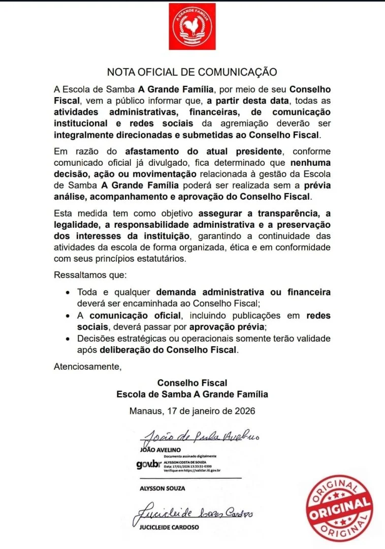 Diante da exposição negativa e do impacto institucional, o Conselho Fiscal decidiu intervir para preservar a imagem da escola, especialmente com a proximidade do Carnaval 2026. Em nota oficial divulgada neste sábado (17), o órgão informou que todas as atividades administrativas, financeiras e de comunicação institucional passam, a partir desta data, a ser submetidas exclusivamente ao Conselho Fiscal.